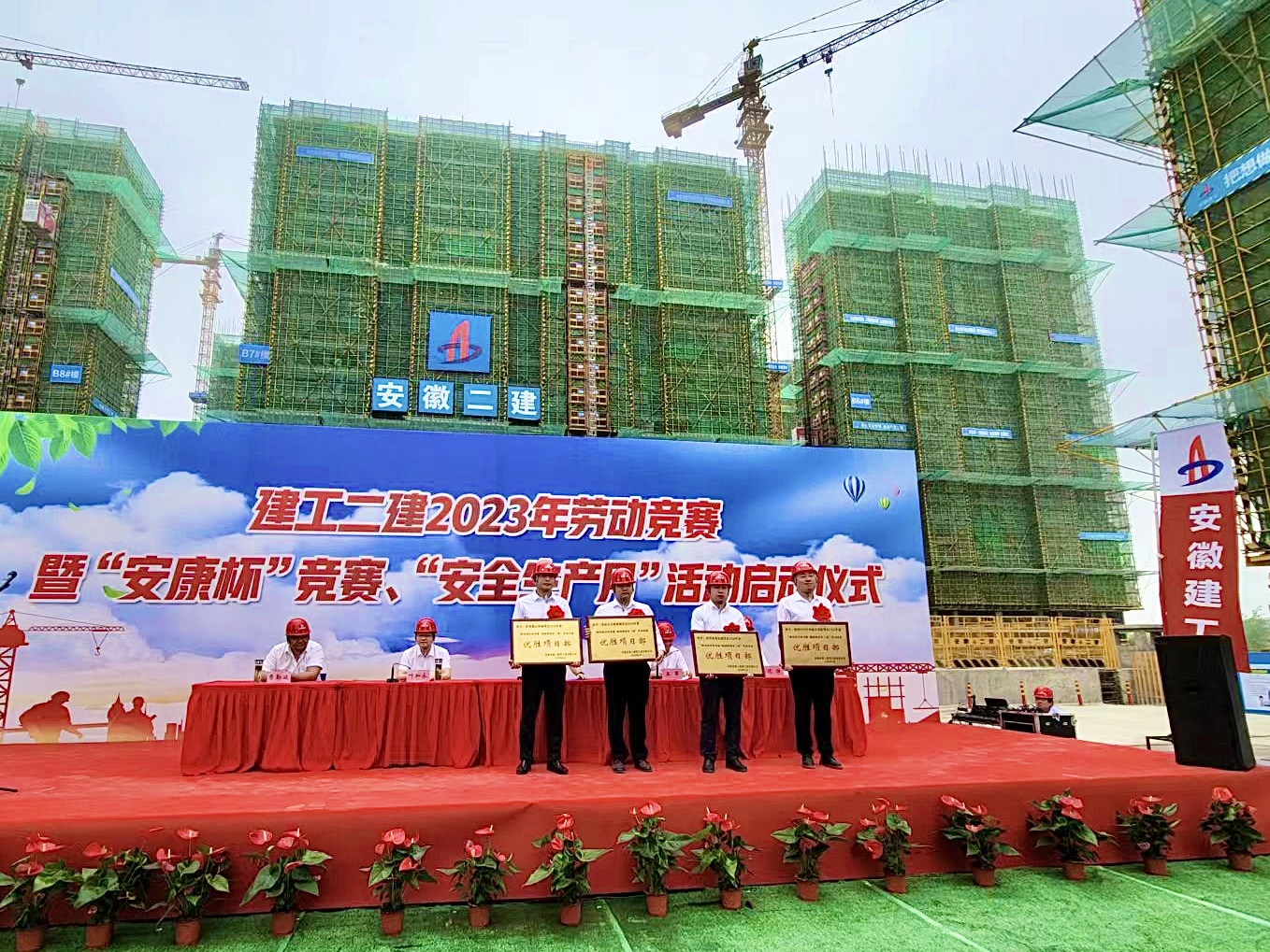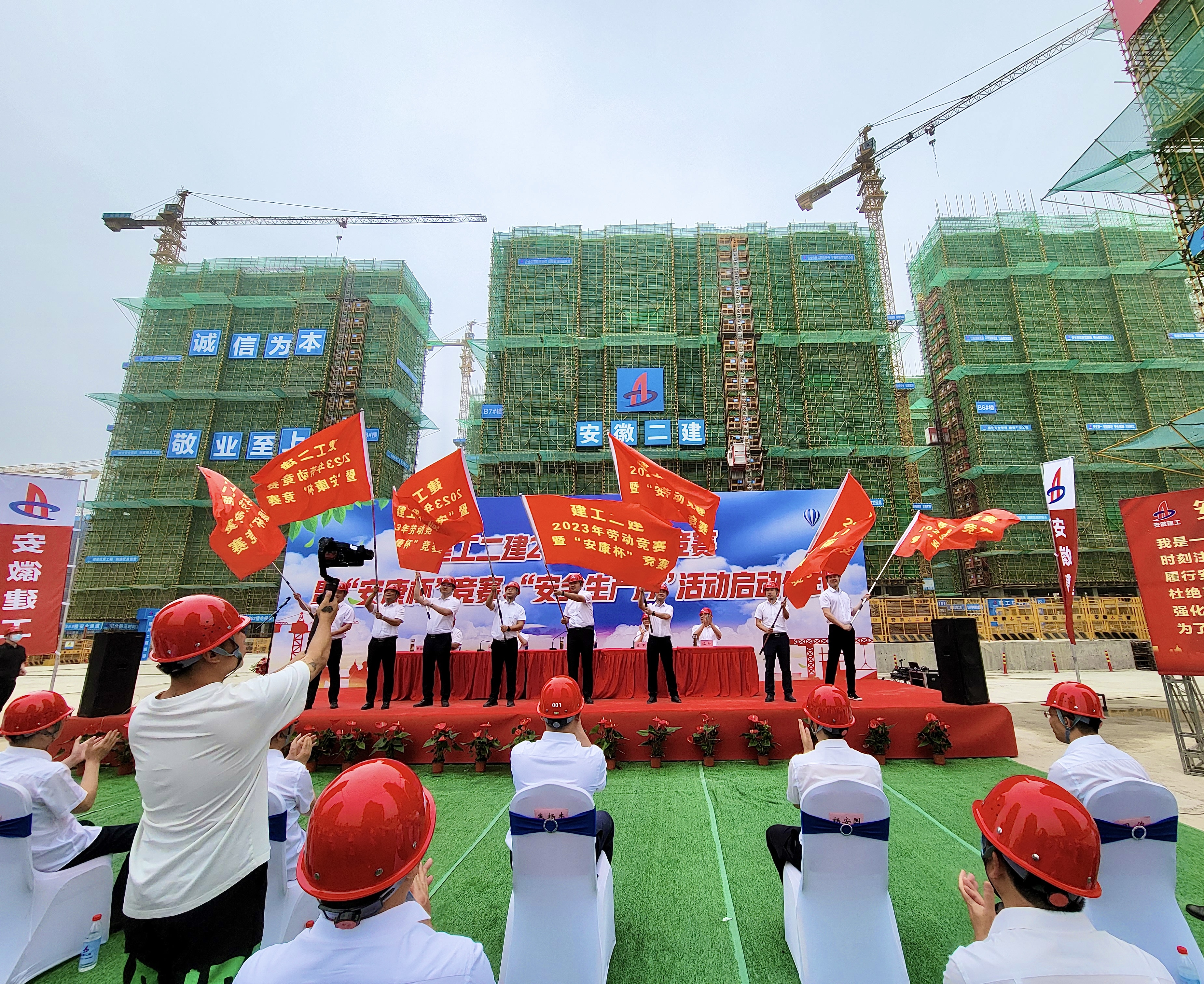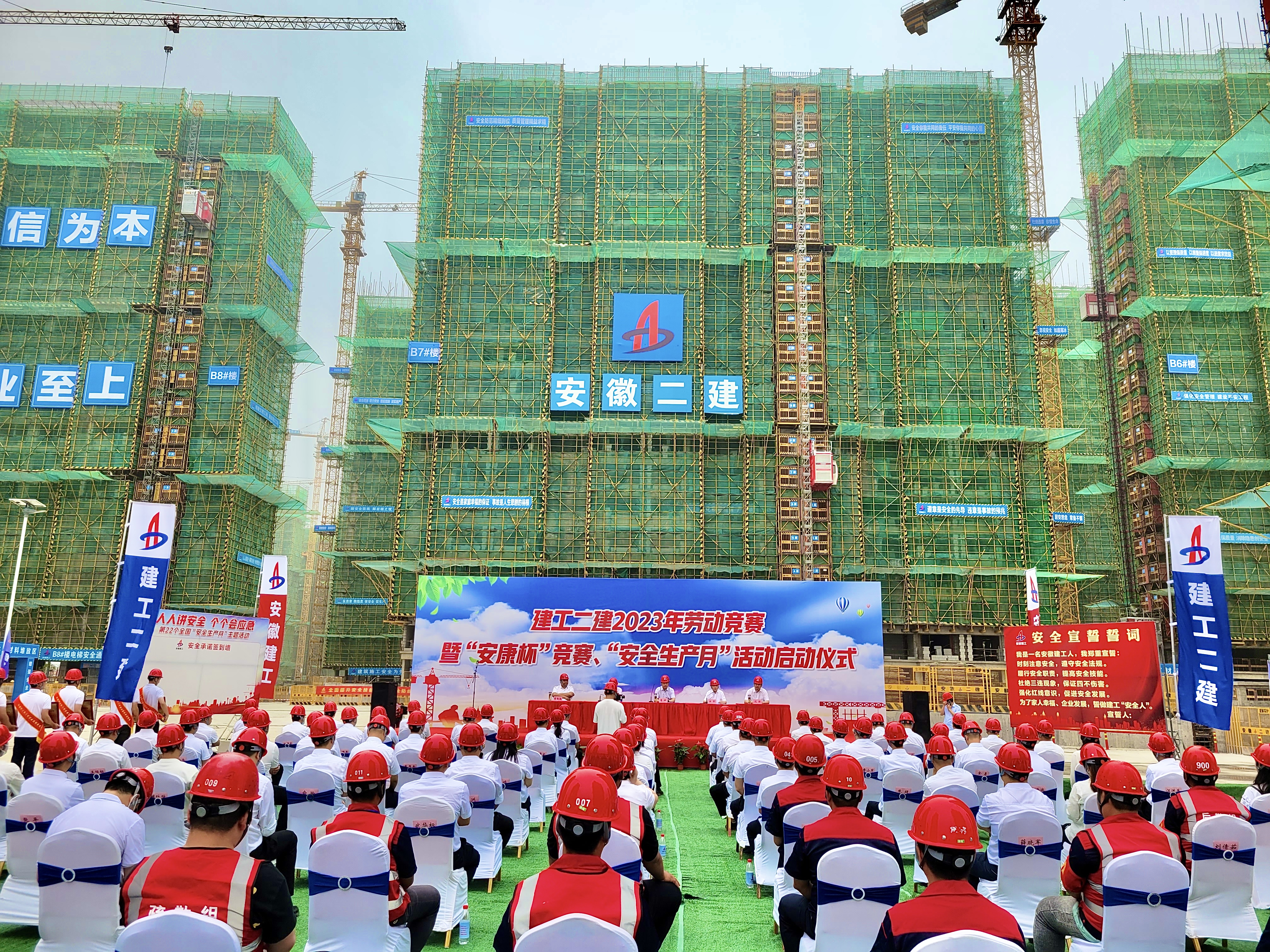 5月30日上午,建工二建在蕪湖中丞濱江時(shí)代項(xiàng)目現(xiàn)場(chǎng)舉行2023年勞動(dòng)競(jìng)賽暨“安康杯”競(jìng)賽、“安全生產(chǎn)月”活動(dòng)啟動(dòng)儀式。公司領(lǐng)導(dǎo)班子成員,勞動(dòng)競(jìng)賽委員會(huì)成員,所屬各單位主要領(lǐng)導(dǎo),分管安全、生產(chǎn)及質(zhì)量副經(jīng)理,工會(huì)(副)主席,工管科、安全科科長(zhǎng),公司工會(huì)、工程管理部、安全管理部、技術(shù)質(zhì)量部相關(guān)人員,受表彰先進(jìn)集體和個(gè)人代表等共百余人參加本次活動(dòng),公司黨委副書(shū)記、工會(huì)主席王軍主持啟動(dòng)儀式。