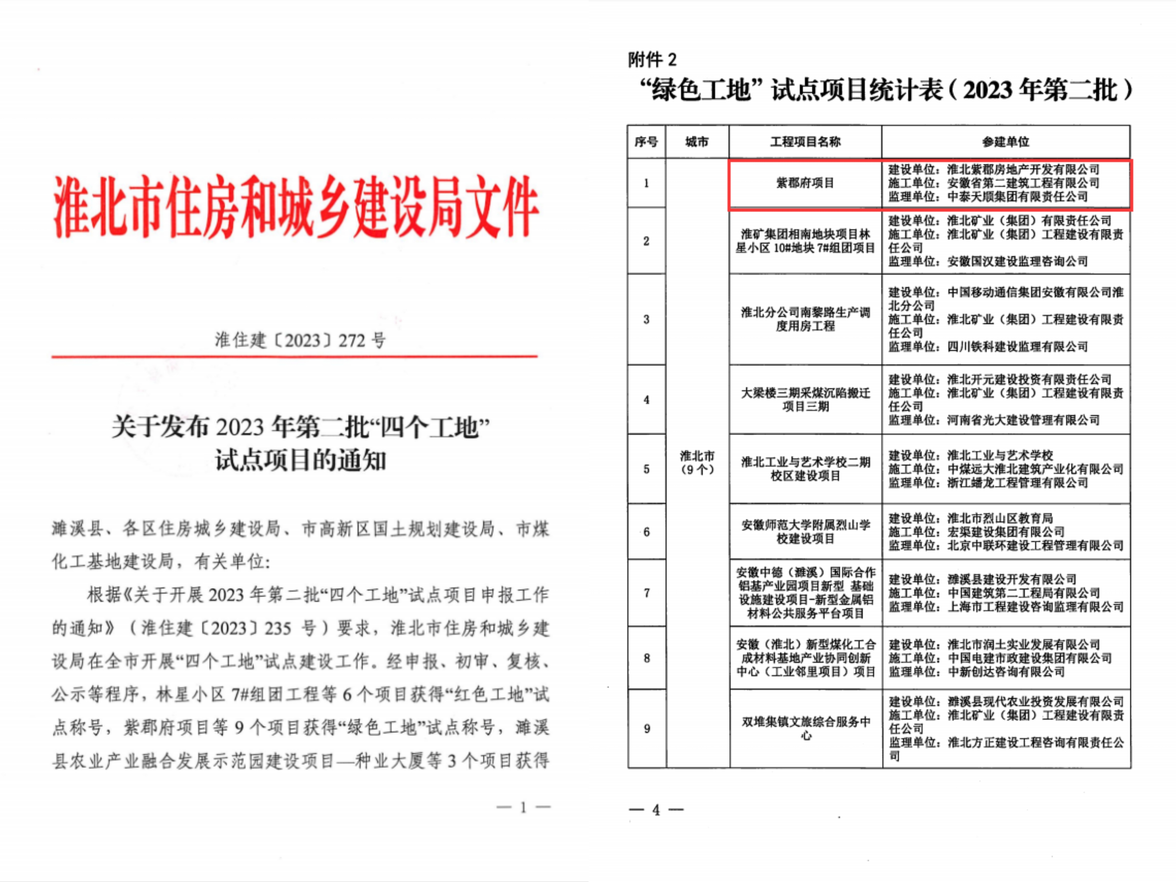 近日,淮北市住房和城鄉(xiāng)建設局發(fā)布了2023年第二批“四個工地”試點項目名單,建工二建第一公司承建的紫郡府項目榮獲淮北市第二批“綠色工地”試點項目稱號。