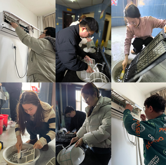 活動(dòng)期間,大家分工協(xié)作、互相配合。志愿者先對(duì)空調(diào)進(jìn)行斷電,打開(kāi)空調(diào)蓋板,取出空調(diào)濾網(wǎng),接著使用抹布和清洗劑對(duì)空調(diào)外機(jī)、濾網(wǎng)等部件進(jìn)行全面細(xì)致的清洗。