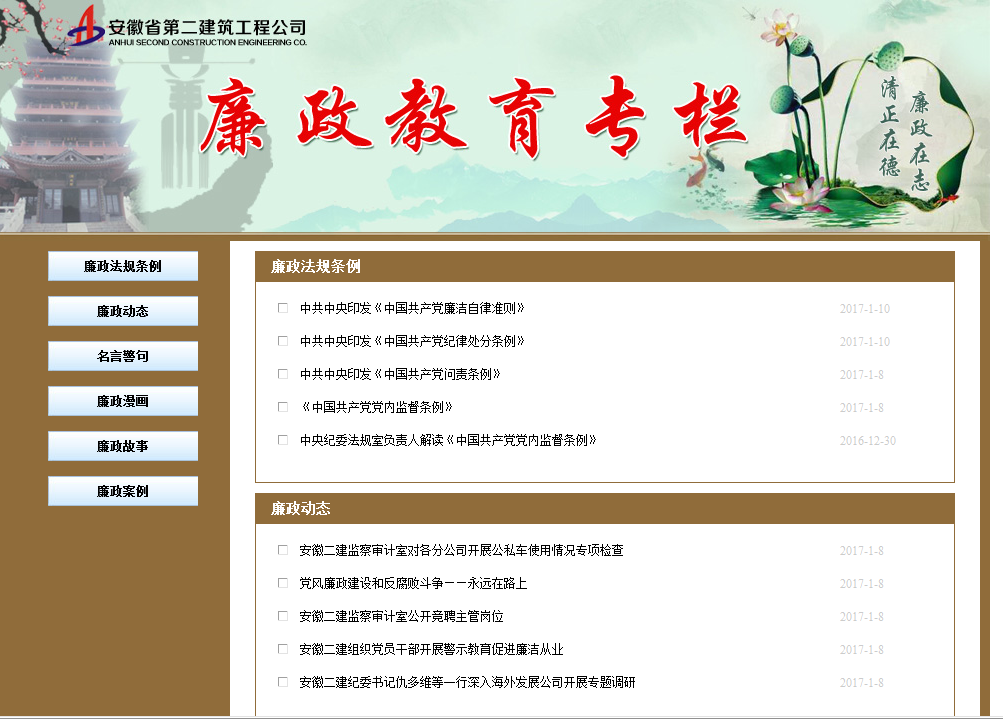 為實(shí)現(xiàn)廉政教育工作日?;?、動態(tài)化,同時結(jié)合省國資委、集團(tuán)紀(jì)委工作要求,經(jīng)過前期的創(chuàng)意和材料收集,在信息部的大力支持下,公司紀(jì)委《廉政教育專欄》于2017年1月10日正式上線。