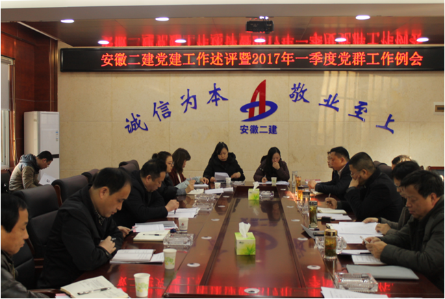 2017年2月15日上午,安徽二建召開(kāi)所屬各黨支部書(shū)記抓基層黨建工作述職評(píng)議會(huì)議暨2017年一季度黨群工作例會(huì)。會(huì)議由公司黨委書(shū)記劉賢奇主持,工會(huì)主席李林,紀(jì)委書(shū)記仇多維出席會(huì)議,所屬各支部黨支部書(shū)記、團(tuán)支部書(shū)記,公司相關(guān)部門負(fù)責(zé)人參加會(huì)議。