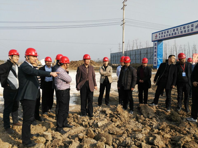 2017年2月15日,集團公司黨委委員、副總經(jīng)理王厚良、總經(jīng)理助理、工程管理部主任童宗勝、安全監(jiān)察局主任殷博、投資公司總經(jīng)理朱忠明等一行赴安徽二建承建的太和縣經(jīng)開區(qū)現(xiàn)代醫(yī)藥產(chǎn)業(yè)及發(fā)藝產(chǎn)業(yè)基礎(chǔ)配套工程PPP項目工程施工現(xiàn)場檢查指導(dǎo)工作。