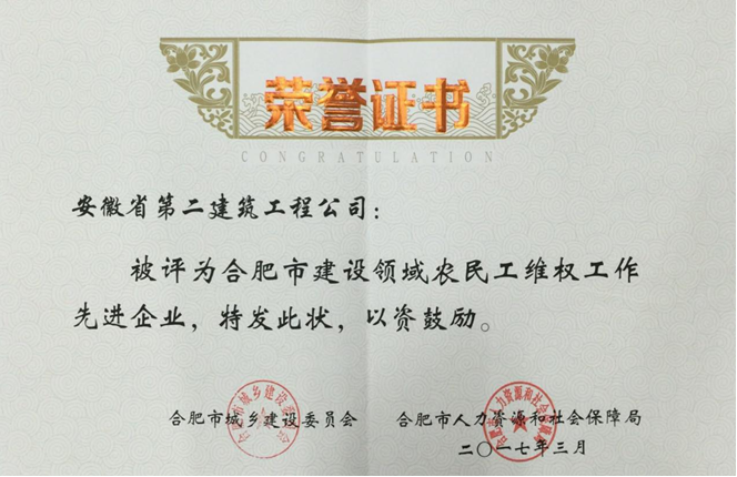 日前,在合肥市建委、合肥市人社局聯(lián)合舉辦的合肥市2016年度建設(shè)領(lǐng)域農(nóng)民工維權(quán)先進(jìn)管理單位、先進(jìn)企業(yè)和先進(jìn)個人的評比表彰活動中,安徽二建公司被合肥市建委授予“建設(shè)領(lǐng)域農(nóng)民工維權(quán)工作先進(jìn)企業(yè)”稱號。