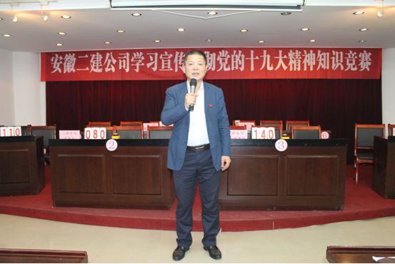 11月7日下午,安徽二建公司在原辦公樓三樓會(huì)議室舉辦了“學(xué)習(xí)宣傳貫徹黨的十九大精神知識(shí)競(jìng)賽”活動(dòng)。來自所屬各黨支部共計(jì)11支代表隊(duì)參加了此次比賽。公司黨委書記劉賢奇、總工程師邱立龍應(yīng)邀出席會(huì)議,工會(huì)主席李林、紀(jì)委書記仇多維、女工部主任王俊共同擔(dān)任本次知識(shí)競(jìng)賽活動(dòng)的評(píng)委。公司機(jī)關(guān)各部門負(fù)責(zé)人,黨群部門全體人員,分公司黨政主要負(fù)責(zé)人、團(tuán)支部書記觀看比賽。