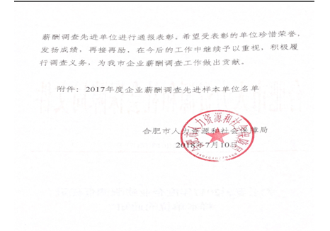 根據(jù)人力資源和社會保障部辦公廳《關(guān)于開展2017年度企業(yè)薪酬調(diào)查先進(jìn)樣本單位的通知》(人社廳函【2017】68號),我公司領(lǐng)導(dǎo)高度重視,按照通知要求精心組織安排人員,以快速高效嚴(yán)謹(jǐn)?shù)墓ぷ鲬B(tài)度,圓滿完成了此次企業(yè)薪酬調(diào)查工作,得到了上級部門的充分肯定,榮獲了“2017年度企業(yè)薪酬調(diào)查先進(jìn)樣本單位”殊榮。