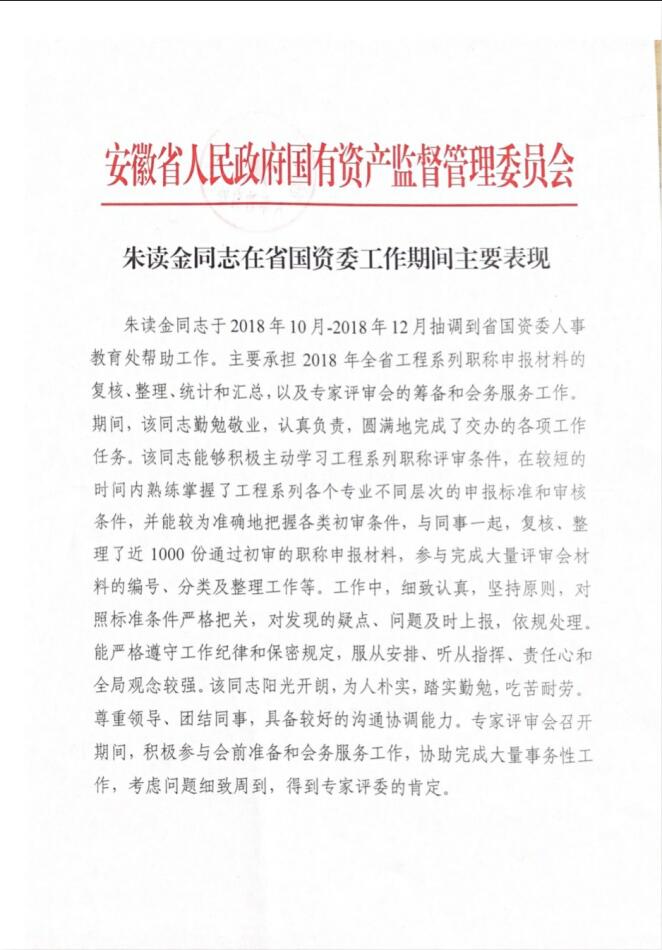 2018年10月-2018年12月被抽調(diào)到省國資委人事教育處幫忙工作,周末加班加點(diǎn),兢兢業(yè)業(yè),與國資委同事一同審查近1000份職稱申報(bào)材料,工作得到專家評(píng)委一致肯定。