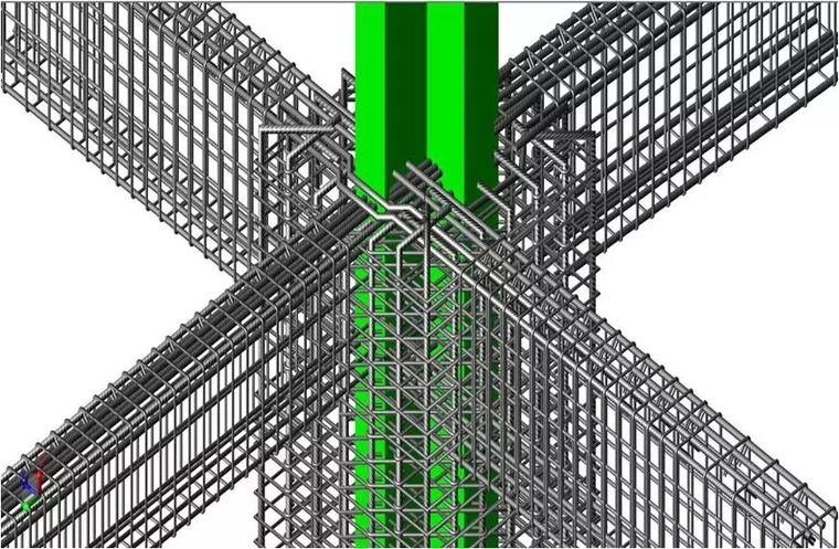 在復(fù)雜節(jié)點(diǎn)的地方,鋼筋的碰撞發(fā)揮著重要的作用。在型鋼混凝土梁柱節(jié)點(diǎn)處,鋼筋數(shù)量眾多,且因?yàn)樾弯摰拇嬖?,造成梁的縱向鋼筋無(wú)法直接拉通。BIM工程師搭建節(jié)點(diǎn)模型,對(duì)鋼筋的排布進(jìn)行調(diào)整,通過(guò)繞彎、預(yù)留洞口、焊接等方式,避免鋼筋與型鋼的碰撞。