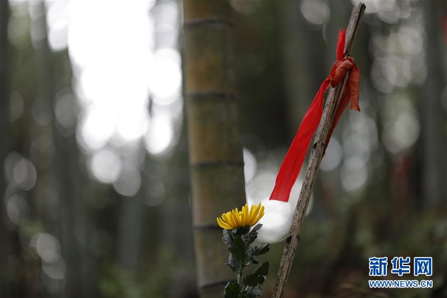 福建武夷山洋莊鄉(xiāng)小漿村張山頭紅軍墓冢上的編號(hào)和紅飄帶(3月25日攝)。新華社記者劉芳攝