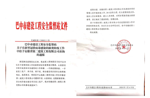 2020年5月6日,四川巴中市安全監(jiān)督站對安徽二建承建的半山逸城二期項目在新冠肺炎防疫疫情防控和有序復(fù)工復(fù)產(chǎn)工作進行通報表揚。