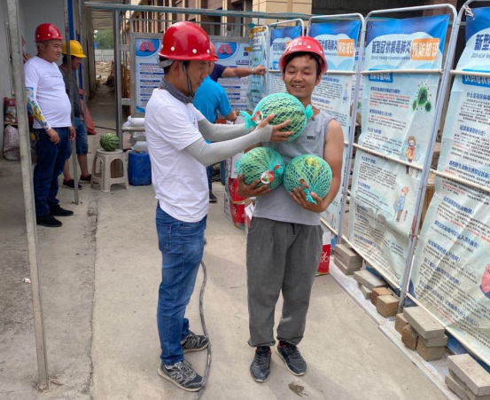 黃盱一行給項(xiàng)目員工送去慰問(wèn)和關(guān)懷,準(zhǔn)備了毛巾、風(fēng)油精、十滴水、西瓜等防暑降溫用品,囑咐大家要合理安排工作時(shí)間,在做好工作的同時(shí),加強(qiáng)自身防護(hù)。