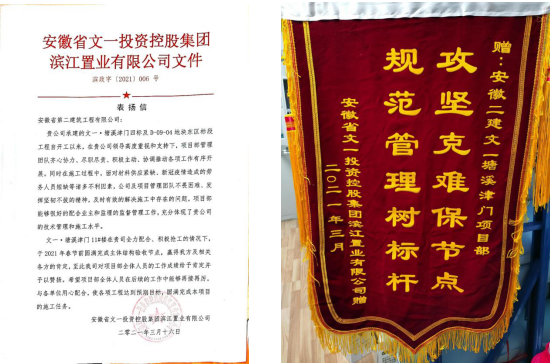 2021年3月31日,獲安徽省文一投資控股集團(tuán)濱江置業(yè)有限公司表揚(yáng),并授予錦旗。