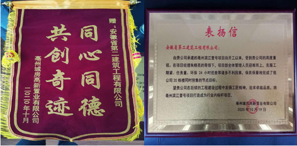北京城房亳州公司真摯邀請四分公司及項目機關(guān)人員參加濱江壹號項目預(yù)售表彰會,北京城房對二建公司的努力與付出表示肯定與認(rèn)可,并頒發(fā)錦旗與表揚信。