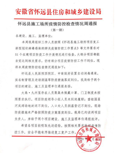 3月6日,懷遠(yuǎn)縣縣長張明廷、住建局局長崔華、質(zhì)檢站站長褚建新一行到安徽二建懷遠(yuǎn)中南瓏府項目指導(dǎo)復(fù)工復(fù)產(chǎn)和疫情防控工作。