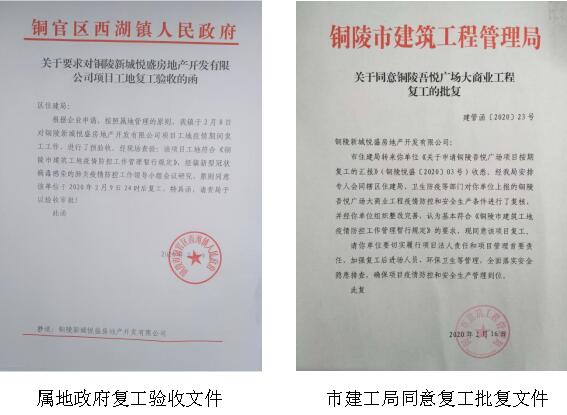 2月12日,銅陵市住建局安排專人會(huì)同銅官區(qū)住建、衛(wèi)生防疫等部門,對(duì)項(xiàng)目部疫情防控及安全生產(chǎn)條件進(jìn)行復(fù)核,認(rèn)為基本符合《銅陵市建筑工地疫情防控工作管理暫行規(guī)定》的要求。2月17日,銅陵市住建局下發(fā)《關(guān)于同意銅陵吾悅廣場(chǎng)大商業(yè)工程復(fù)工的批復(fù)》,同時(shí)提出要加強(qiáng)復(fù)工后進(jìn)場(chǎng)人員環(huán)保衛(wèi)生管理,全面落實(shí)安全隱患排查,確保項(xiàng)目疫情防控和安全生產(chǎn)管理到位。
