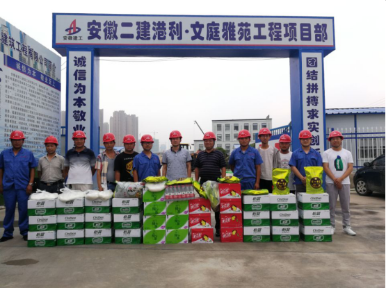 炎炎日正午,灼灼火俱燃,為做好一線工人防暑降溫工作,7月5日,四分公司支部書記董建民、生產(chǎn)副經(jīng)理馬勁松等代表分公司赴淮北港利文庭雅苑項(xiàng)目開展“送清涼”活動(dòng)。