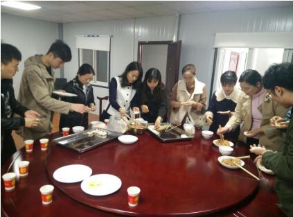 團(tuán)員們精心挑選餡料、餃皮,充分做好準(zhǔn)備工作。洗菜、拌餡、包餃子各個程序井然有序,大家分工明確、緊密配合,有的挑餡,有的抹皮,兩手一掐,一個胖嘟嘟的餃子就成型了。有的手忙腳亂,不是餡放多撐破皮,就是包成餛飩效果,大家相互調(diào)侃,隨著一聲“下鍋”,餃子在鍋中咕咚咕咚的翻騰,一個個迫不及待的浮出水面。形態(tài)各異的餃子在大家的期待下出鍋了,大家看著自己的勞動成果,臉上洋溢著滿足的微笑,食堂內(nèi)到處縈繞著歡聲笑語。