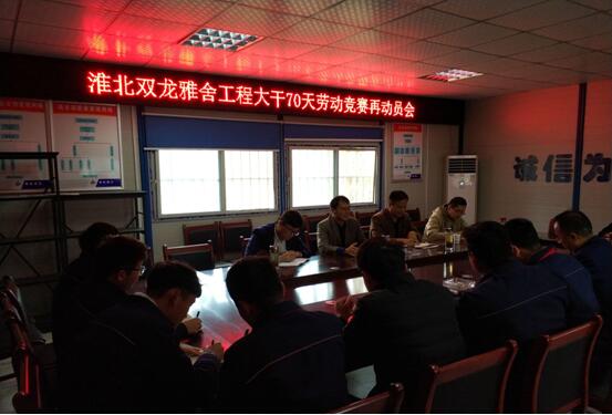 自十月初公司開展“大干70天”勞動競賽活動以來,淮北雙龍雅舍項目在項目經(jīng)理盧因東的帶領(lǐng)下積極響應(yīng)公司號召,合理安排工作計劃,精心組織施工部署,全面掀起大干熱潮。會上,崔書斌經(jīng)理要求項目部繼續(xù)保持高昂的工作熱情,倒排施工計劃,抓住關(guān)鍵節(jié)點(diǎn)。蒯家江宣貫了公司勞動競賽活動精神,指示項目部落實 “比、學(xué)、趕、幫、超”活動方式,提高認(rèn)識,端正態(tài)度。強(qiáng)調(diào)年輕管理人員要加強(qiáng)自身學(xué)習(xí),提高工作執(zhí)行力,養(yǎng)成良好的工作習(xí)慣;同時也要有面對挫折的勇氣,做到干一行愛一行,同心協(xié)力為二建的發(fā)展貢獻(xiàn)一份力量。