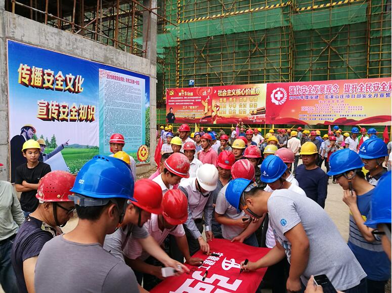 “我是一名安徽建工人,我鄭重宣誓:時刻注意安全,遵守安全法規(guī)。履行安全職責,提高安全技能。杜絕三違現(xiàn)象,保證四不傷害。強化紅線意識,促進安全發(fā)展……”。嘹亮的宣誓聲響徹整個施工現(xiàn)場,震撼人心。6月1日早晨7:00,在宿松安建·龍溪山莊工程施工現(xiàn)場,由業(yè)主、監(jiān)理及安建·龍溪山莊項目部員工近百人組成的宣誓隊伍莊嚴宣誓,并簽字承諾,借此拉開“安全生產(chǎn)月”活動序幕。