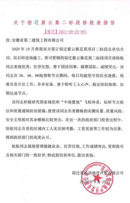 近日,第三分公司宿遷中南紫云集花苑項目的施工員徐航收到了一封業(yè)主單位發(fā)來的表揚信,平日大方灑脫的他在收到信后露出了靦腆的笑容,他表示:“這是自己的分內工作,以后會繼續(xù)保持”。平日里的徐航工作責任心強,在項目3#、4#、8#搶收節(jié)點期間,兢兢業(yè)業(yè)堅守崗位,每日加班加點至凌晨,在他和所在片區(qū)工人的努力下,項目如期完成節(jié)點任務。針對項目現(xiàn)場工作總是親歷親為,在面對裝配式項目的施工難點、重點工作時,通過對專業(yè)書籍的學習,不斷攻堅克難,提高能力,增強技能。他負責的片區(qū)在質量風險、勞務實名制等方面工作明顯優(yōu)于其他樓棟的工作,在業(yè)主方“飛檢”、政府檢查中得到高度認可。