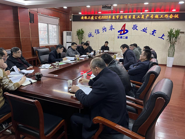 2月16日下午,安徽二建公司在一樓會議室召開了節(jié)后項目復(fù)工復(fù)產(chǎn)專題工作會議。公司總經(jīng)理李建成、財務(wù)總監(jiān)王干出席會議,會議由副總經(jīng)理葉和永主持。公司工程管理部、法務(wù)部(債權(quán)回收辦)、財務(wù)資產(chǎn)部、物資設(shè)備部、成本合約部、安全管理部、技術(shù)質(zhì)量部負(fù)責(zé)人、所屬各單位經(jīng)理、生產(chǎn)副經(jīng)理參會。
