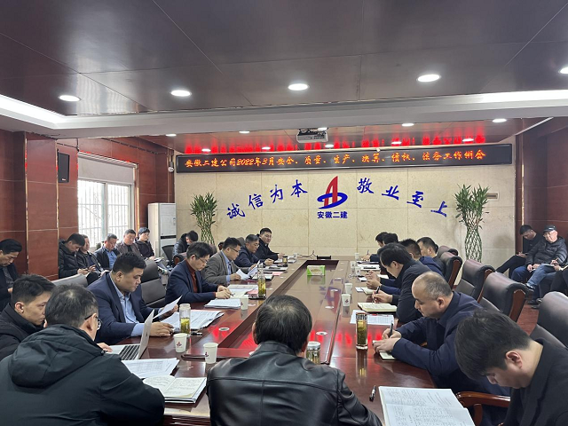 春潮涌動(dòng),新意盎然。3 月7日下午,安徽二建公司在一樓會(huì)議室召開(kāi)了2022年3月安全、質(zhì)量、生產(chǎn)、決算、債權(quán)、法務(wù)工作例會(huì)。公司總經(jīng)理李建成、副總經(jīng)理費(fèi)勤波出席會(huì)議,公司相關(guān)部門負(fù)責(zé)人、所屬各單位經(jīng)理、分管領(lǐng)導(dǎo)及工管、安全科長(zhǎng)參加會(huì)議,副總經(jīng)理葉和永主持會(huì)議。
