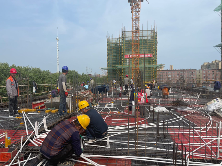 各主樓拔地而起,各單體結構以五天一層的澆筑速度穩(wěn)步攀升。隨著6#、9#、10#的封頂,施工現(xiàn)場也正式進入二次結構施工階段。土方開挖、混凝土澆筑、屋面構架施工、墻體砌筑有序穿插施工,一臺臺施工升降機的安裝,猶如雨后春筍破土而出、鏗鏘有力,施工現(xiàn)場又掀起一輪新的大干熱潮。