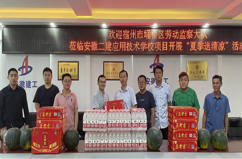 烈日炎炎,酷暑難當(dāng),為確保一線工人身心健康,督促做好夏季高溫期間安全生產(chǎn)工作,7月15日上午,宿州埇橋區(qū)勞動(dòng)監(jiān)察大隊(duì)黨支部書(shū)記、副大隊(duì)長(zhǎng)王建一行赴安徽二建宿州應(yīng)用技術(shù)學(xué)校項(xiàng)目開(kāi)展“夏季送清涼”活動(dòng),為奮戰(zhàn)在高溫下的建筑工人送來(lái)了真摯的問(wèn)候和關(guān)懷。
