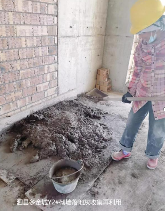 此次檢查要求砌筑階段的項(xiàng)目每日發(fā)布對(duì)落地灰、磚損耗的檢查水印照片于工作群,定期上報(bào)檢查情況說明。各項(xiàng)目積極響應(yīng),其中泗縣多金城項(xiàng)目在該項(xiàng)檢查中實(shí)施效果較為突出,在落地灰集中過篩后,摻少量水泥,利用細(xì)料作粉刷刮糙和砌墻的灰漿。落地灰的收集利用,既節(jié)約材料、降低工程成本,又有利于施工現(xiàn)場(chǎng)標(biāo)準(zhǔn)化的管理。