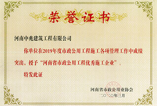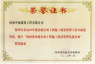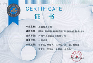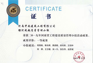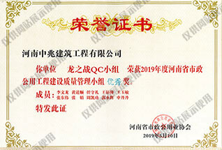 2019年度河南省市政公用工程建設(shè)質(zhì)量管理小組優(yōu)秀獎(jiǎng)
